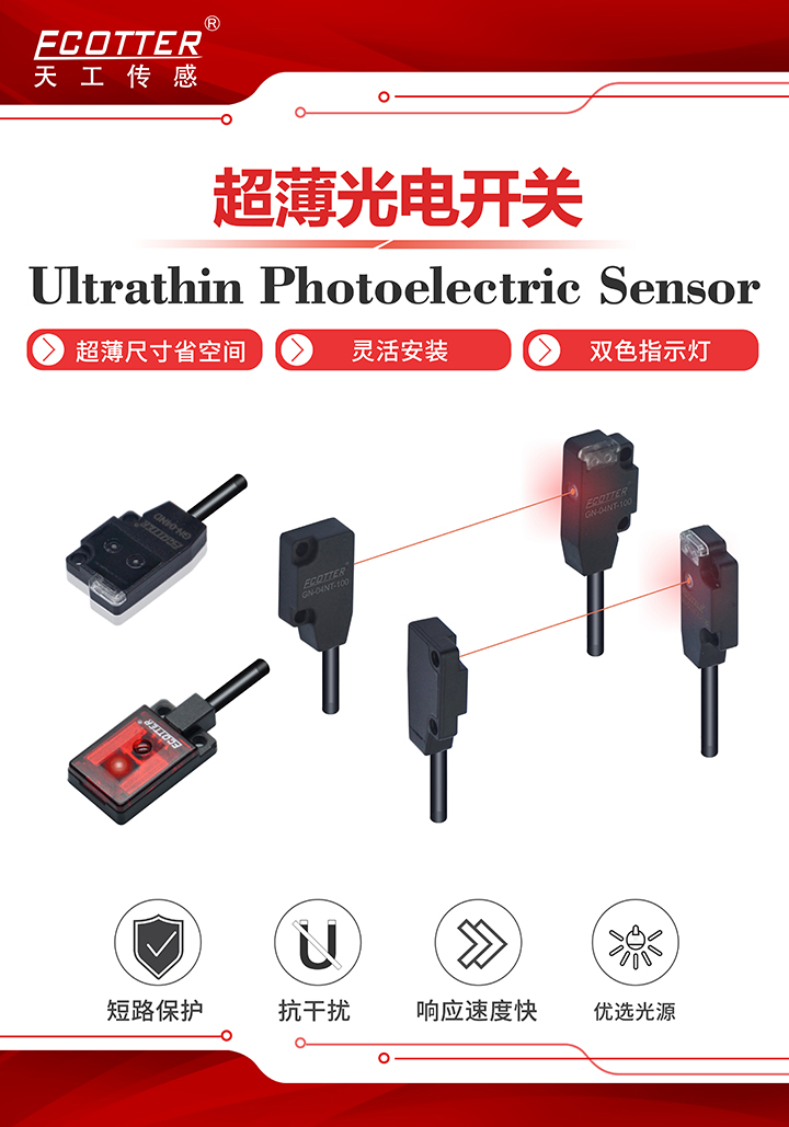 超薄型光電開關配備方便觀察的雙色指示燈設計,上電亮紅色指示燈,輸出亮綠色指示燈。