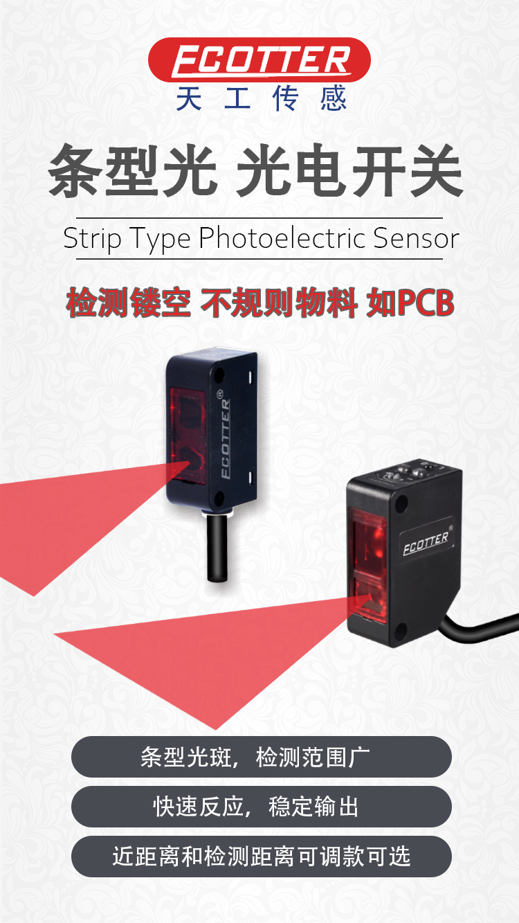 光電開關在檢測時,只需要被檢測物體返回部分光就可以感應到,而條形光光電開關的光斑是擴散的,被檢物體的鏤空部分不會影響檢測,不規(guī)格物體滿足條件同樣可以被感應到。