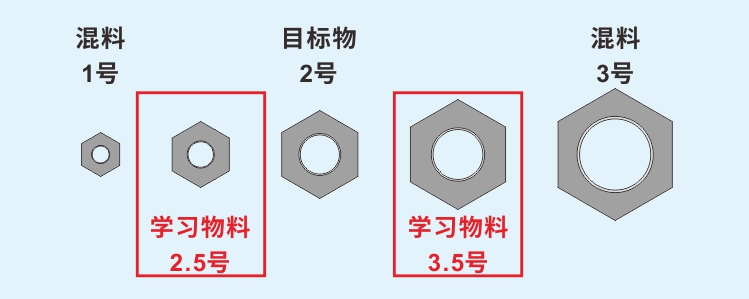 目標(biāo)物通過傳感器檢測(cè)區(qū)域時(shí)會(huì)以各種姿勢(shì)進(jìn)行,所以我們?yōu)榱吮苊饴z,經(jīng)常會(huì)選擇比原目標(biāo)物稍大和稍小的物料進(jìn)行學(xué)習(xí)。