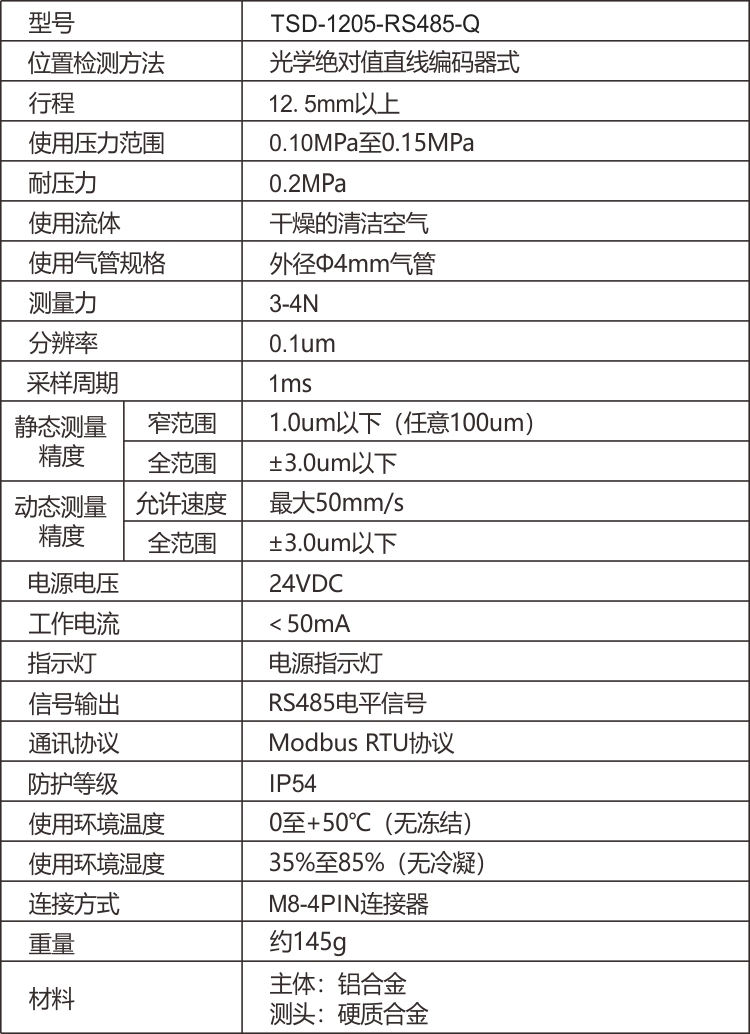 這款氣動型接觸位移傳感器使用氣管規(guī)格為外徑4mm,使用氣壓0.1~0.15mpa,測量力3~4N。測量精度可達3um。