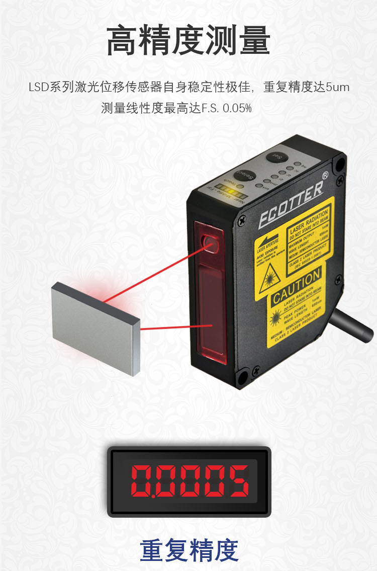 ECOTTER 激光位移傳感器LSD系列可精確非接觸測量被測物體的位置、位移等變化,主要應(yīng)用于檢測物體的位移、厚度、振動(dòng)、距離、直徑等幾何量的測量。