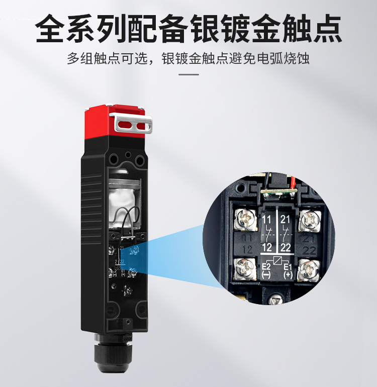 ECOTTER安全門鎖的鎖定力 強電磁式抗拉力強制鎖定力1300N以上。全系列標(biāo)配復(fù)合銀鍍金觸點,避免電弧燒蝕,保證優(yōu)秀導(dǎo)電性能。安全門開關(guān)外殼采用PA66阻燃材質(zhì),耐高溫;電纜接頭防水;抗撞擊可選配金屬鎖頭加強防沖擊能力。