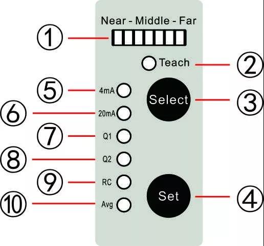 1、按Select鍵5s進入功能設置模式,此時Teach紅燈亮;
