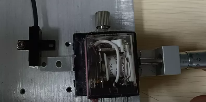 這里有一個重復精度測試儀器,我們可以通過旋動標尺推動另一端的物塊前進,直到傳感器發(fā)出信號,此時我們記錄下這個標尺的位置。