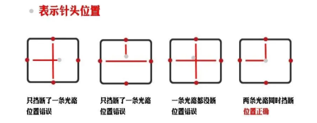 當(dāng)針嘴在檢測區(qū)域內(nèi),每次都按照相同的運動方向移動,每次都剛好擋斷2條光路,此時兩個傳感器同時輸出信號,可以判斷針嘴在正確的水平位置,實現(xiàn)XY軸對針效果。